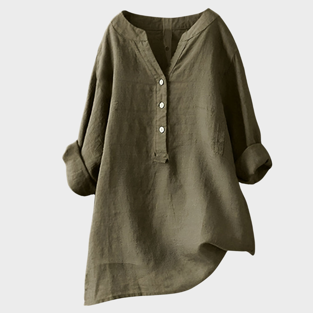 Ova oversize košulja savršena je za sve koji žele opušten, a istovremeno elegantan izgled. Široki kroj pruža maksimalnu udobnost, dok elegantni gumbi i diskretan V-izrez dodaju profinjen dodir. Lagano asimetričan rub čini je modernom i laskavom. Odlično se kombinira s trapericama, tajicama ili suknjama – pristaje uz sve.