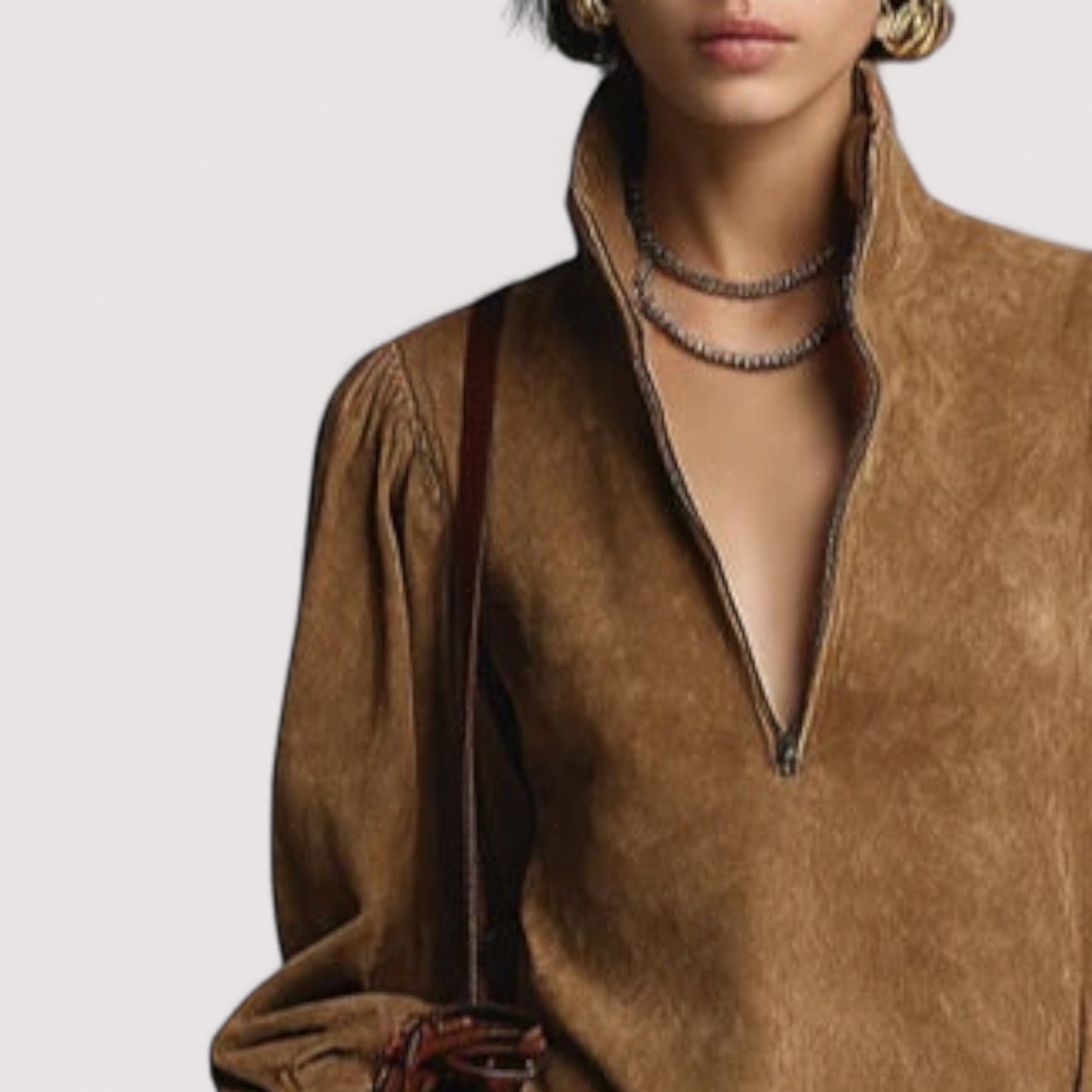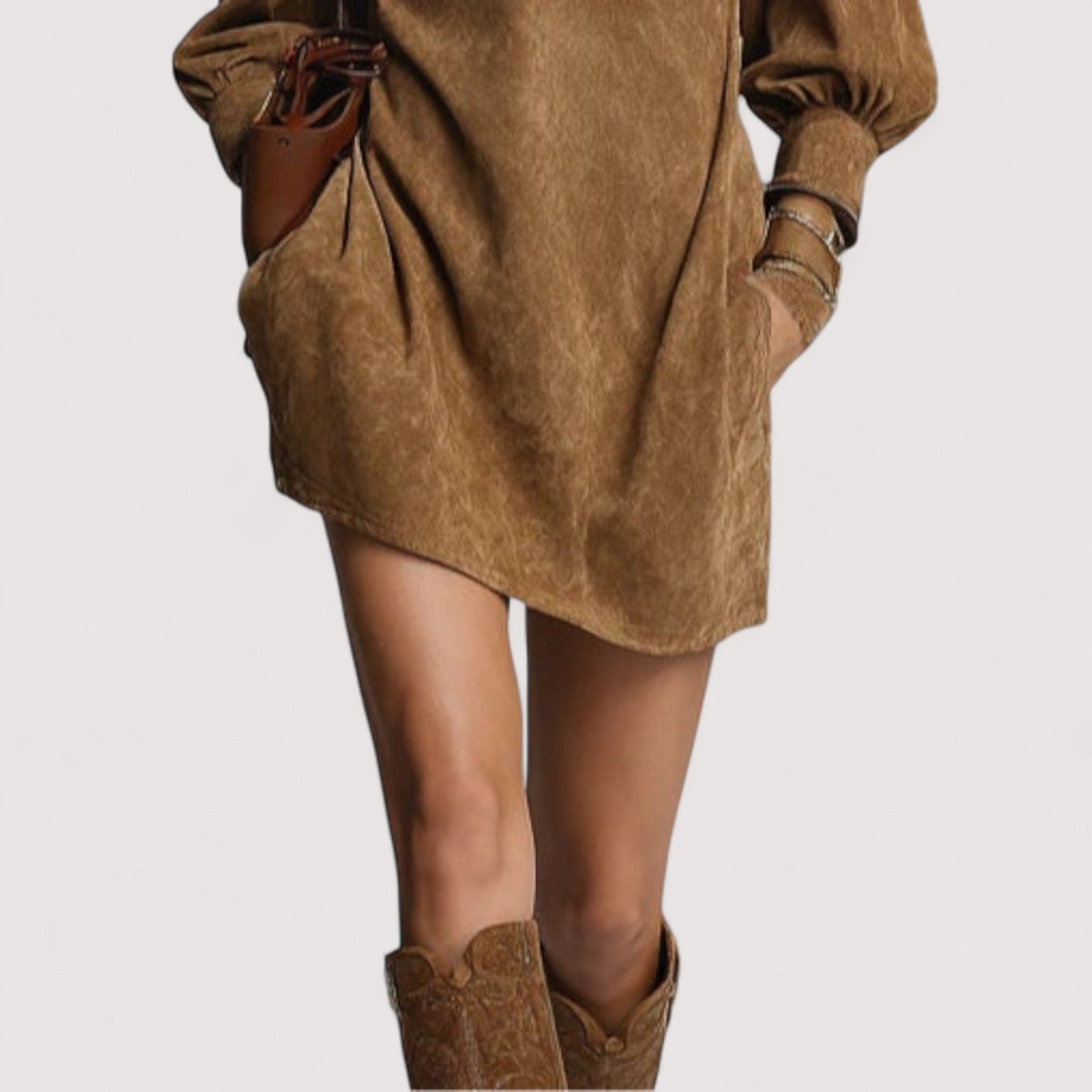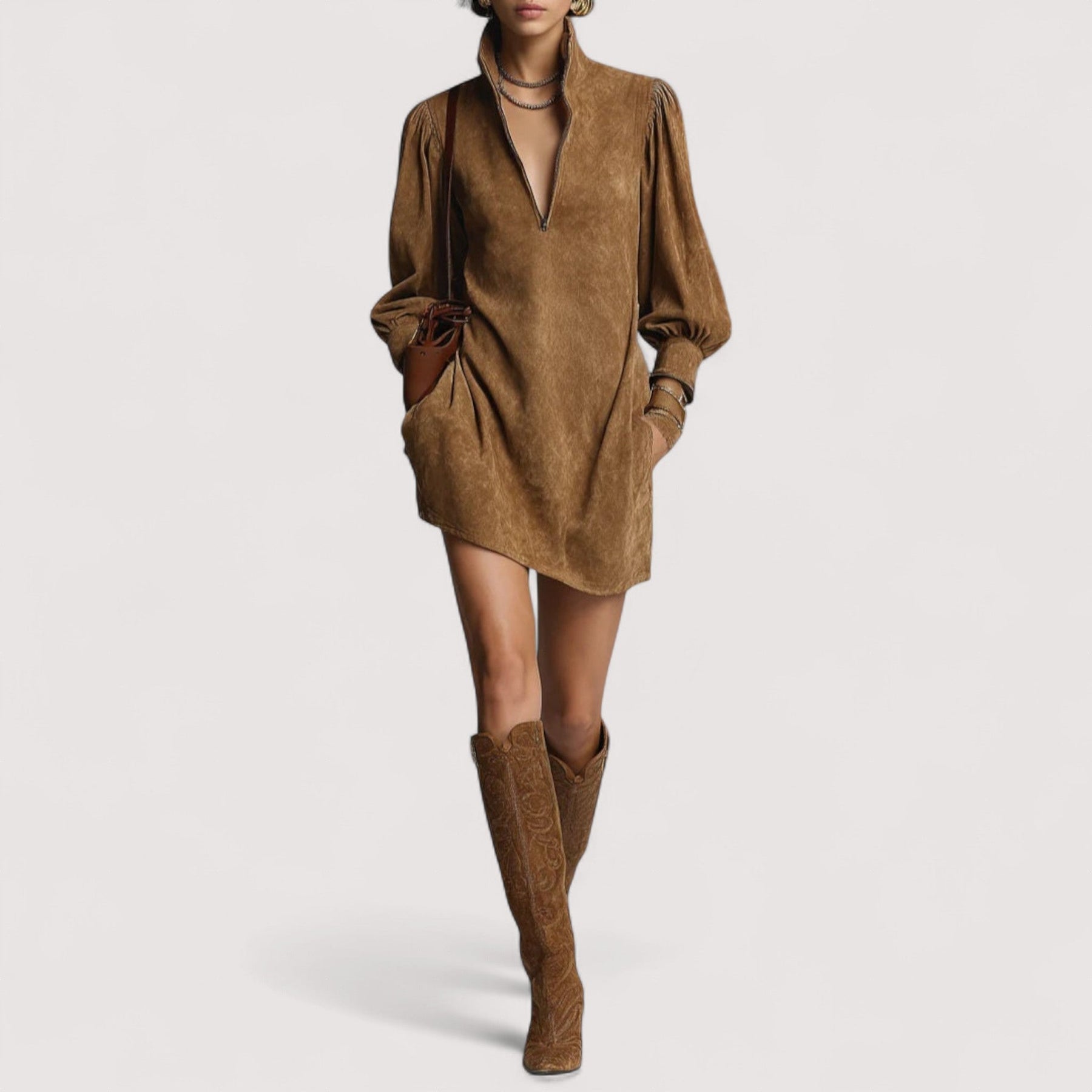 Leira™ | Smeđa opuštena mini haljina od brušene kože s patentnim zatvaračem i dolčevitim ovratnikom