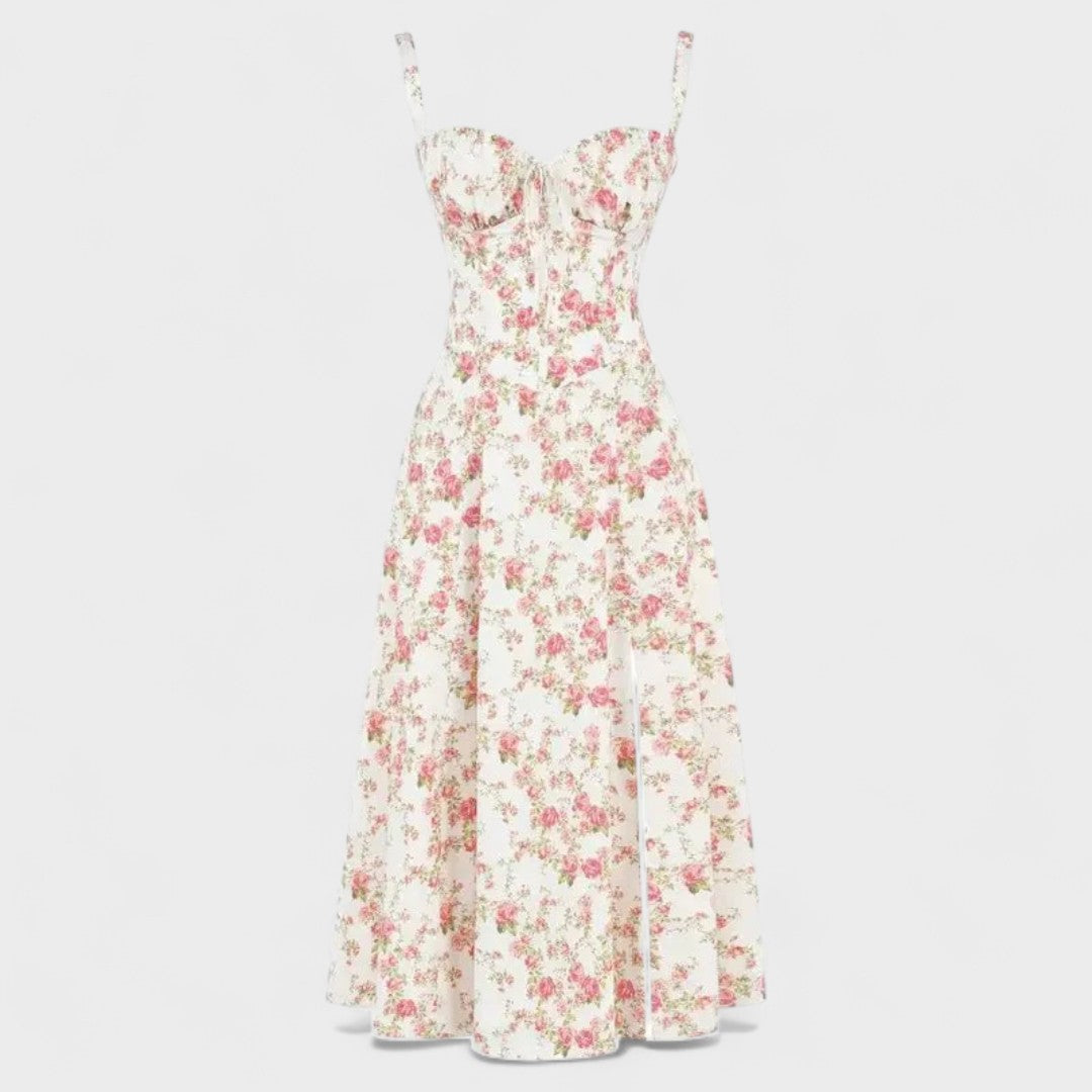 Ova ženska midi haljina ističe se savršenim krojem koji naglašava siluetu i pruža profinjen izgled. Elegantni korzetni gornji dio s naramenicama i decentnim detaljima pruža sofisticiran dojam, dok suptilan prorez na donjem dijelu dodaje dašak senzualnosti i slobode pokreta. Idealan je za posebne prilike, večernje izlaske ili romantične trenutke u kojima se želite zablistati.