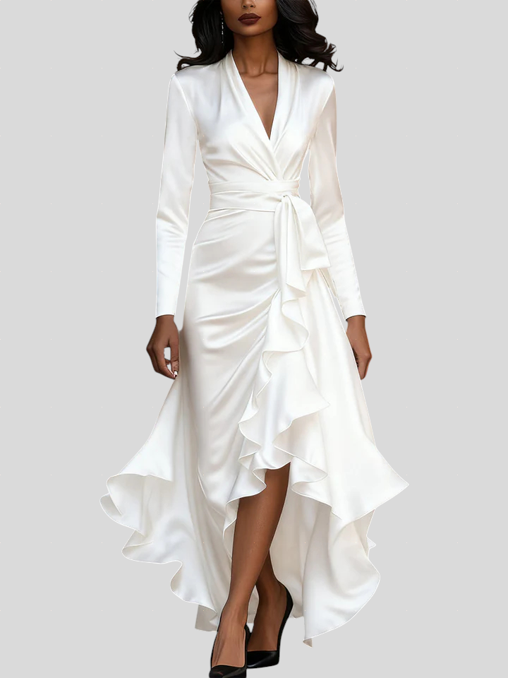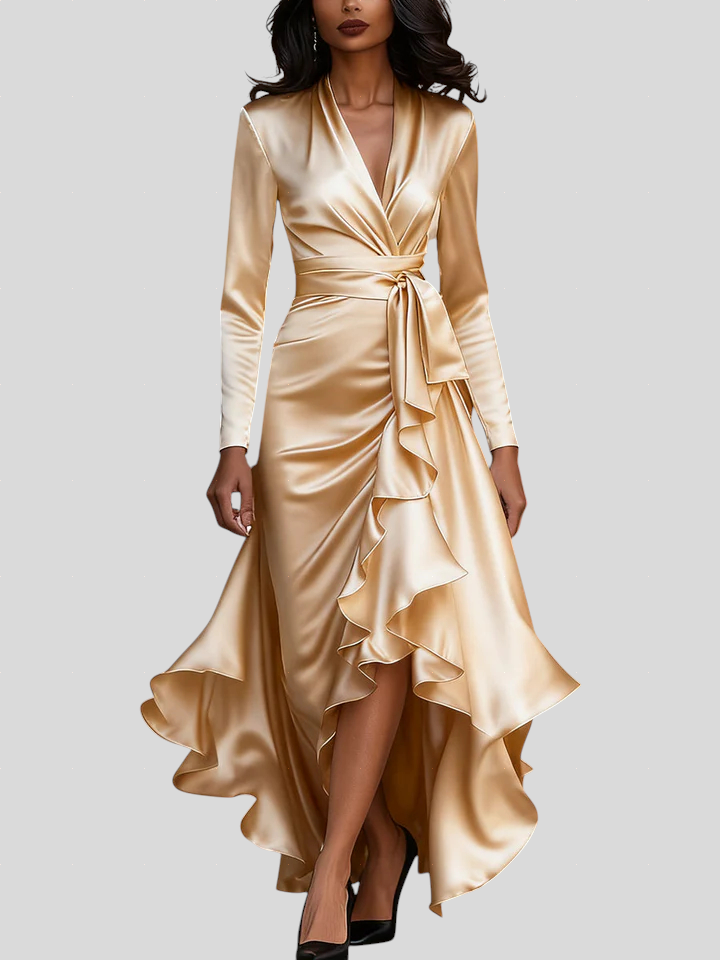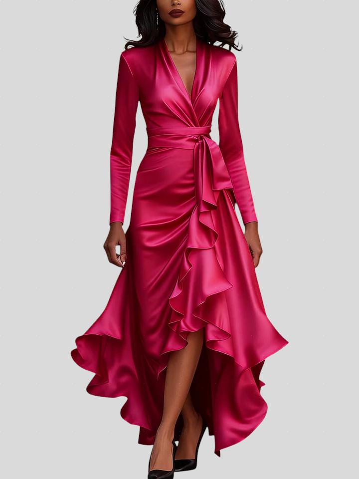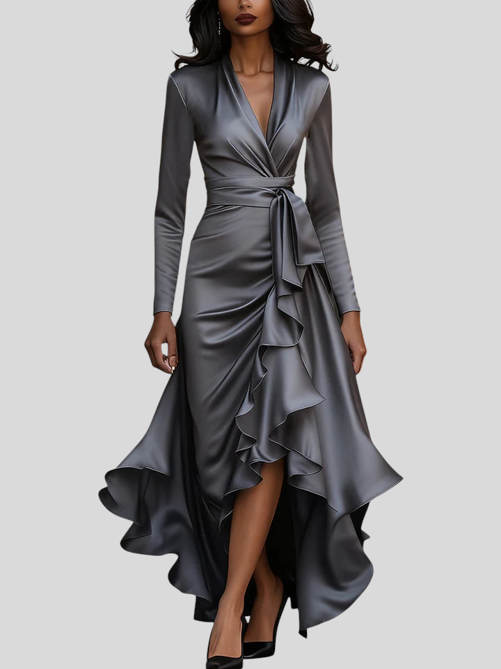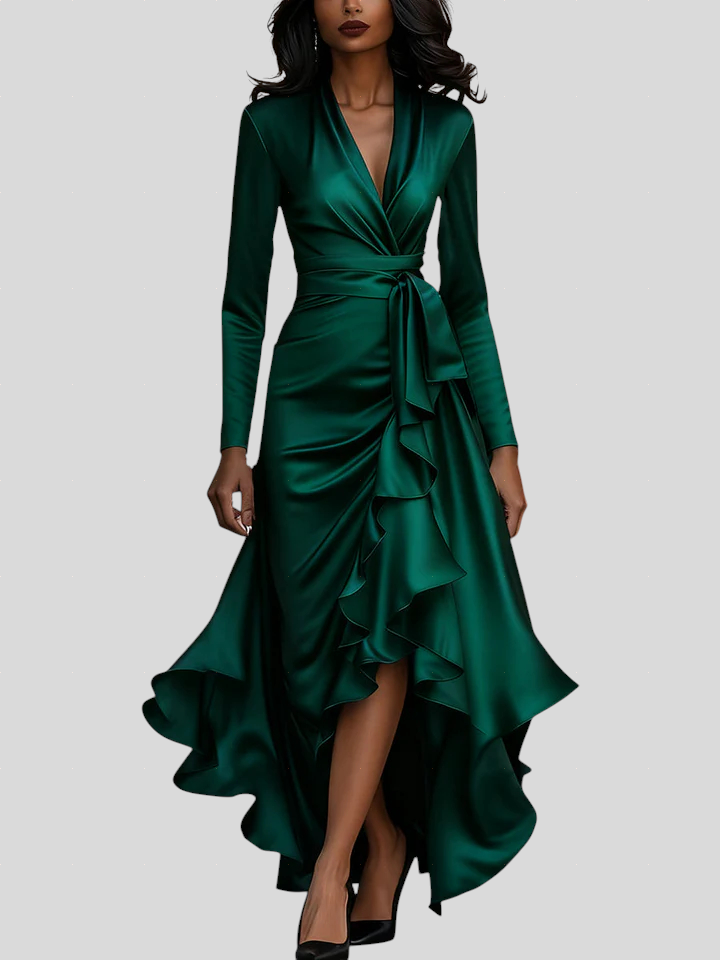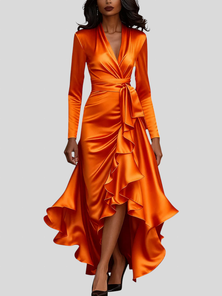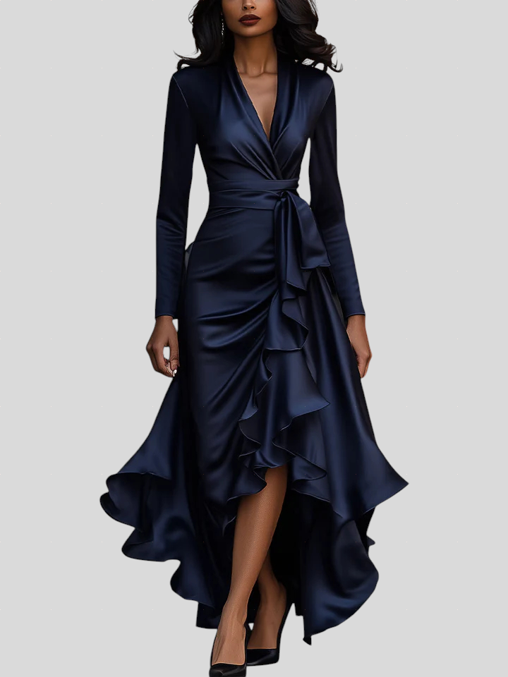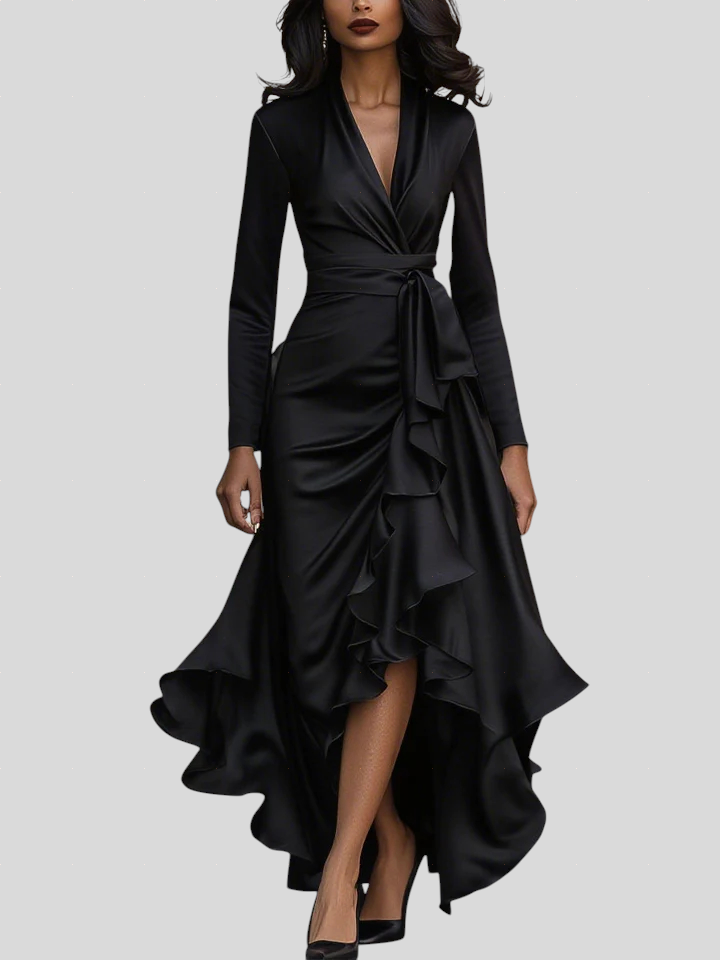Ova haljina utjelovljuje spoj elegancije, samopouzdanja i luksuza. Izrađena od visokokvalitetnog satena koji nježno prianja uz tijelo, naglašava prirodne linije i kreće se s lakoćom pri svakom koraku. Romantični volani i pojas u struci stvaraju savršenu ravnotežu između ženstvenosti i profinjenosti, čineći ovu haljinu idealnim izborom za večernje događaje, svečane prilike ili romantične večeri.