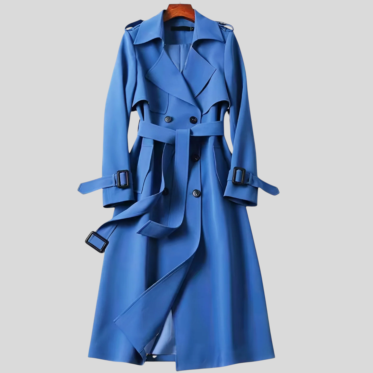 • Detalji inspirirani krojačkim majstorstvom – dvostruki gumbi i podesivi pojas za rafiniran dojam.