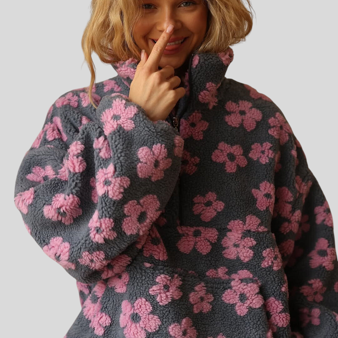 Kombinacija mekoće, udobnosti i šarme. Flis s cvjetnim uzorkom donosi vedrinu i razigranost, savršen za grijanje hladnih dana bez gubitka elegancije. Moderan dizajn s patentnim zatvaračem sprijeda osigurava praktičnost, dok mekana tekstura pruža osjećaj potpunog zagrljaja.