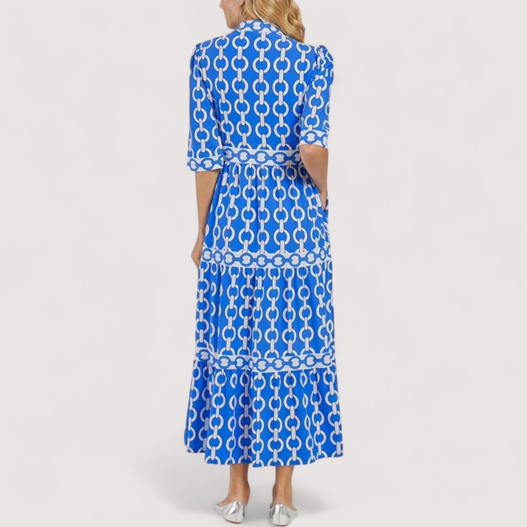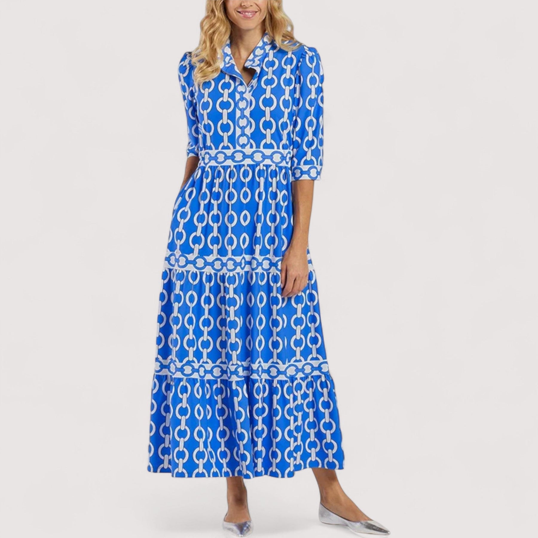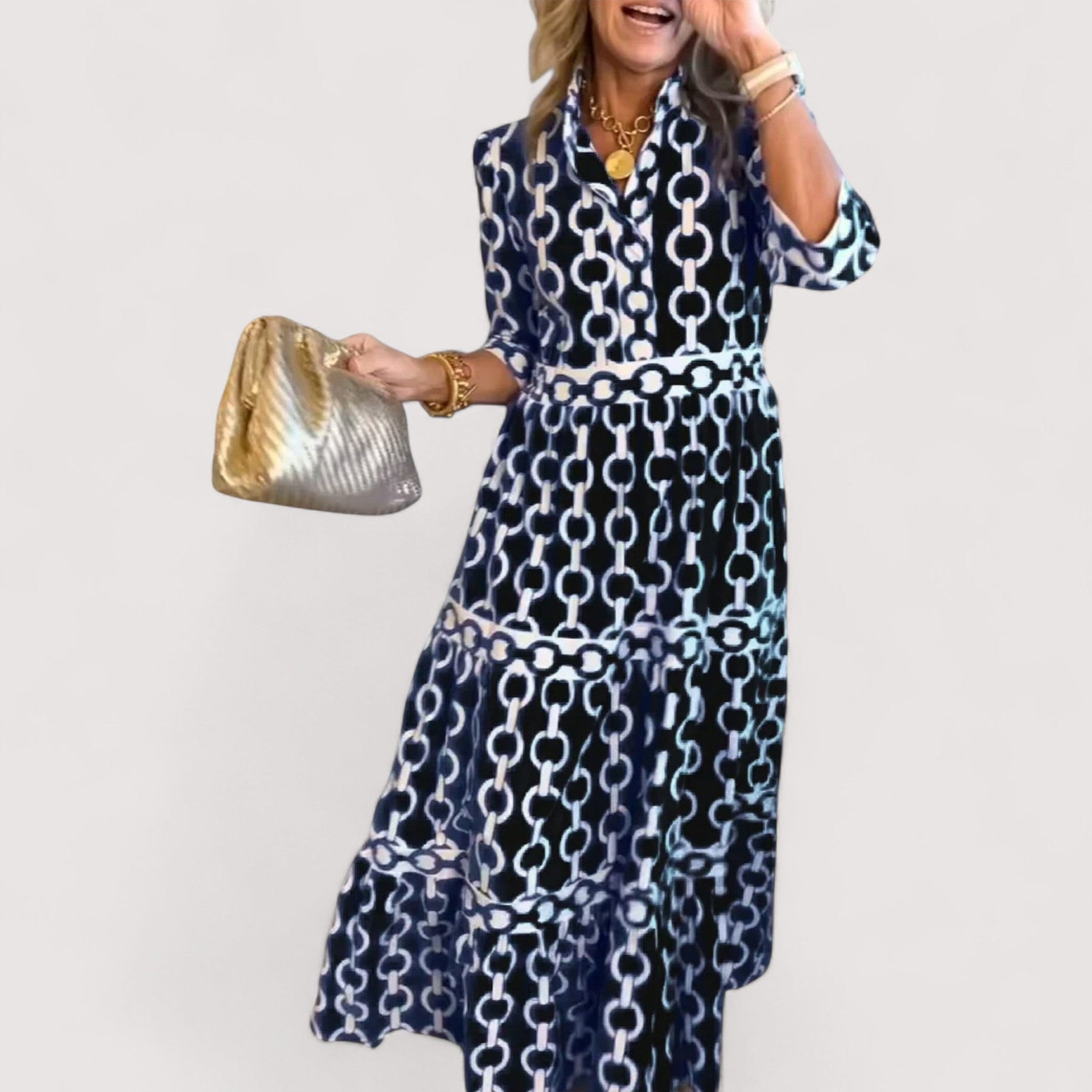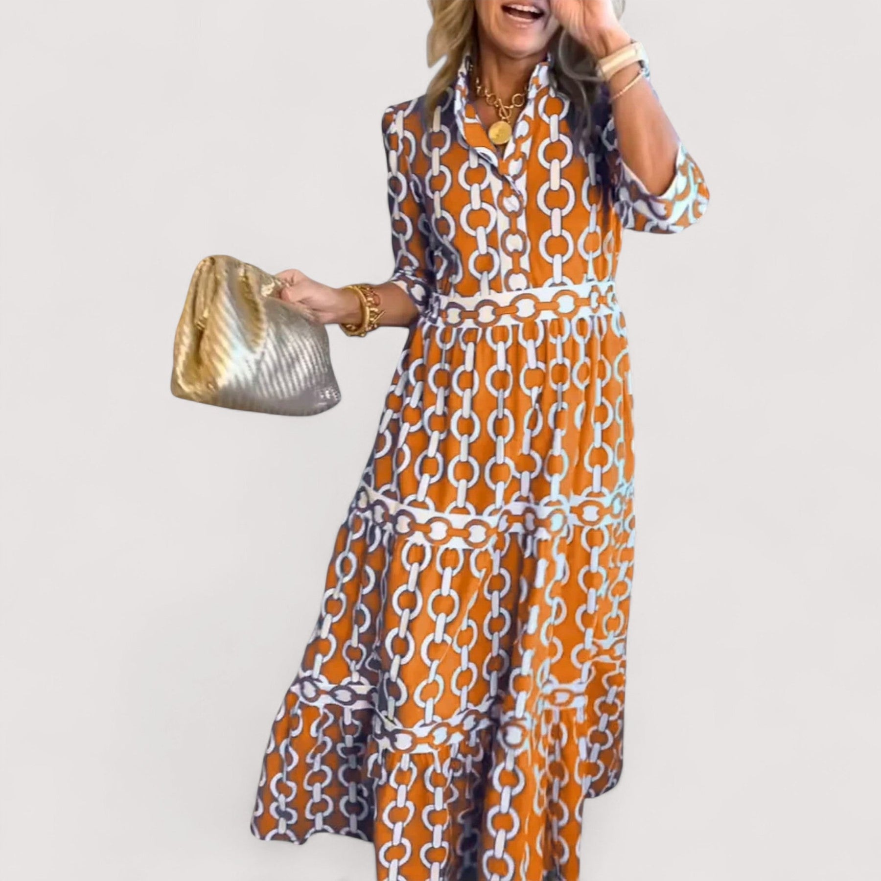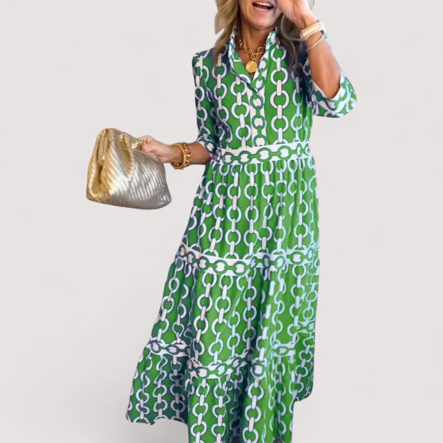 Ova midi haljina za žene izrađena je od lagane, prozračne tkanine i savršena je za proljeće i ljeto. Ima tričetvrt rukava, ovratnik košulje, kopčanje sprijeda cijelom dužinom i struk koji naglašava figuru. Široka suknja na volane stvara midi siluetu. Idealna za dnevne izlete i društvene događaje.