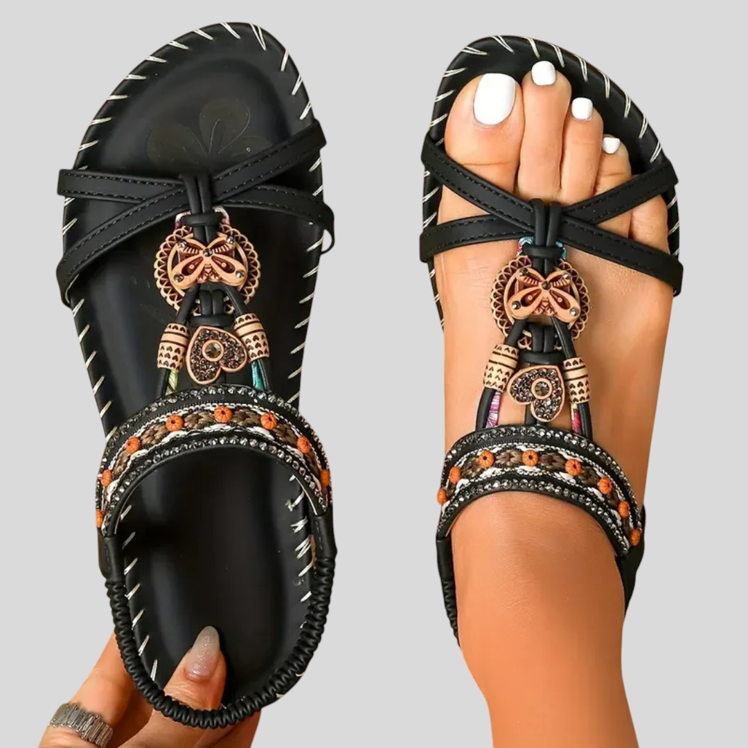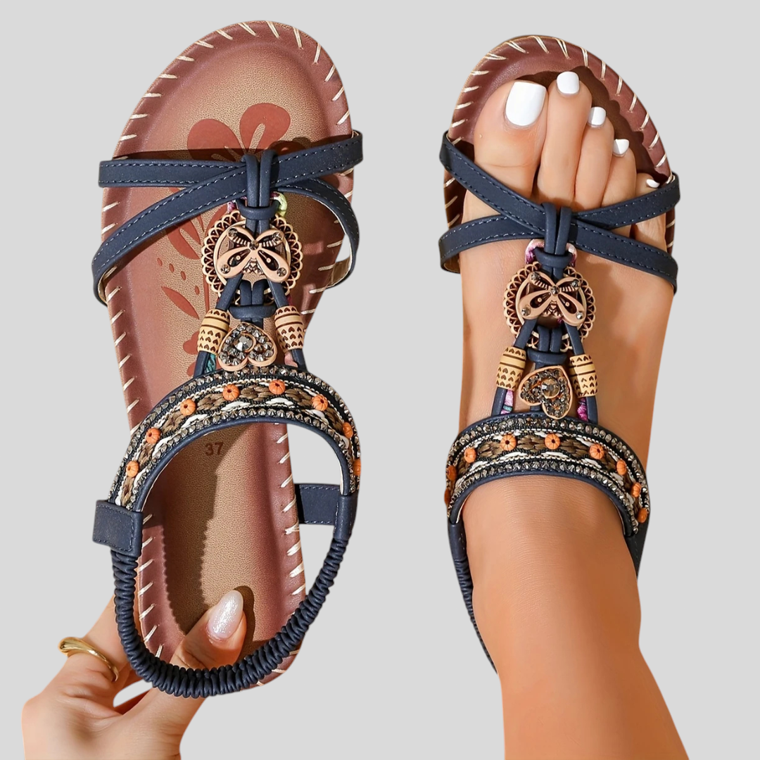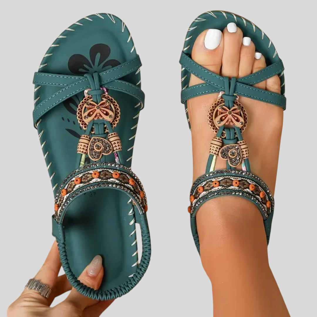 Ove sandale spajaju udobnost i stil u očaravajućem dizajnu koji se ističe ručno rađenim detaljima. S pažljivo izrađenom završnom obradom i jedinstvenim ukrasnim elementima, pružaju sofisticiran i svestran boho izgled. Lagane i udobne, savršene su i za opuštene dane i za posebne trenutke.